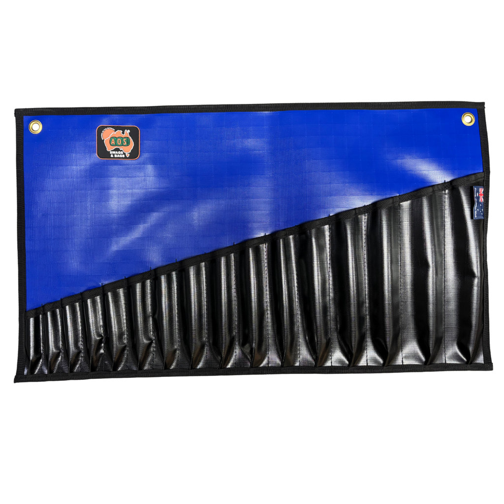 AOS Australian made spanner tool rolls wraps are designed and manufactured to protect your general tools or spanners and keep them all in one easy to access place, they also double as a handy shadow board to be able to see if all of your tools are back and have been returned to you after the job has been completed or the end of the shift has arrived. Our AOS spanner cases have been constructed from Heavy duty Rip stop PVC that is tough as nails, these are the perfect solution to replace your old spanner wrap that has fallen apart and they will last for years to come. they have a 50mm touch tape closure and pleated pockets to suit your tools and spanner with ease.