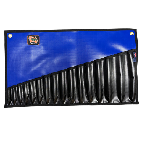 We have multiple colours and sizes to choose from allowing you to easily identify which spanner roll has your imperial set and metric set by simply looking at the colour of the wrap. Our Tool rolls can be hung by the Brass eyelets on either top corner with ease if they are used in a fixed location and the material can be marked with permanent marker or paint marker if required.